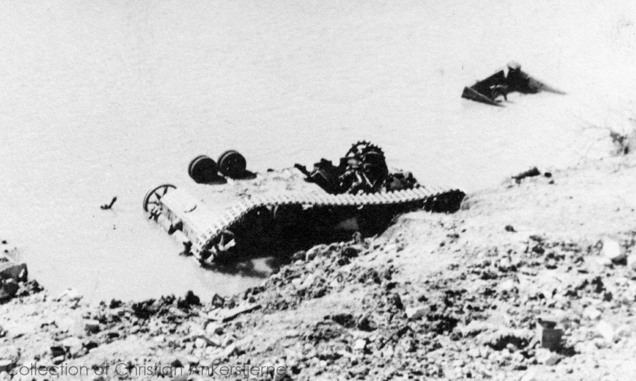 Destroyed Pz Kpfw IV flipped over in water.
