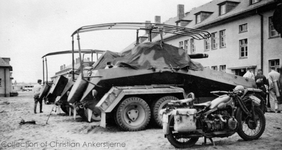 Pre-war photograph of two Schwerer Panzerspähwagen (Fu) (Sd Kfz 232) (6 Rad) (front and rear), and a Schwerer Panzerspähwagen (Sd Kfz 231) (6 Rad). The name on the side of the first Sd Kfz 232 is Derfflinger. At the front is a BMW R11 motorcycle.
